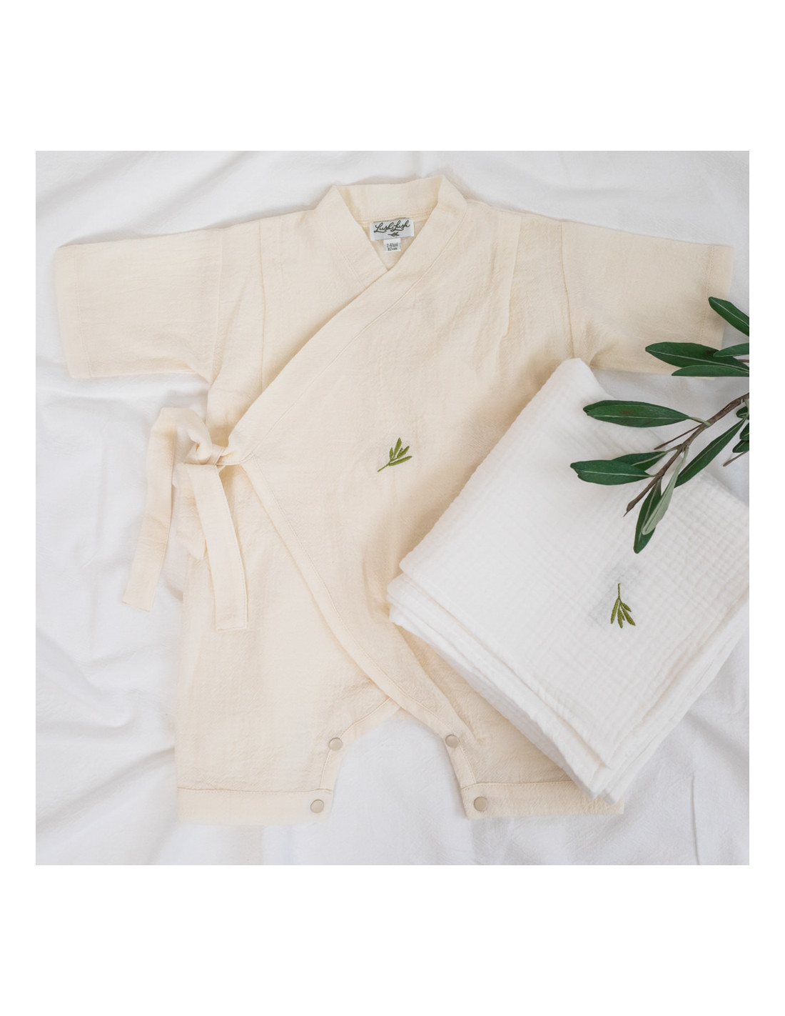 Un set cadou pentru baby shower unisex util și elegant: un kimono din bumbac ivoire și o păturică în culoare la alegere.